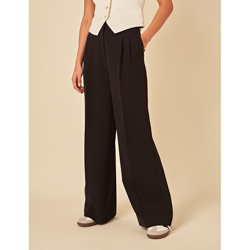 The ultimate black trousers. Our Jax trousers sit high on the waist with a fluid, wide-leg silhouette and front pleats for a tailored feel. Pair with the matching waistcoat for a polished look. High-waisted fit Wide leg cut that skims the body Size tip: we