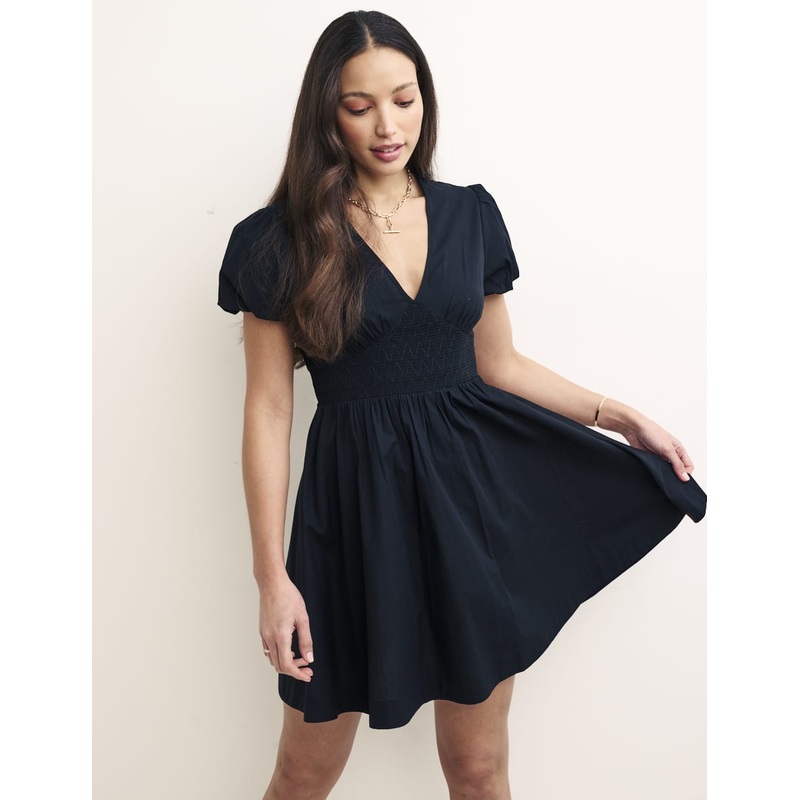 A black mini dress. A must-have in any wardrobe, Jewel is detailed with a shirred waist panel finished with zig zag stitching and stylish puff sleeves. Take her on holiday or wear her to that event. Youll turn to this one again and again.V-neckShort puff s