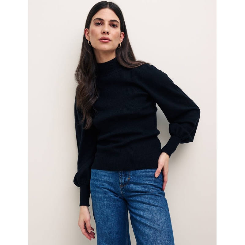 The perfect day-to-night piece. This black top has a statement cut-out that ties at the back. Long balloon sleeves and a high neck complete the piece. Team with denim. Funnel neck Long balloon sleeves Ribbed texture Soft stretch jersey fabric Open back det