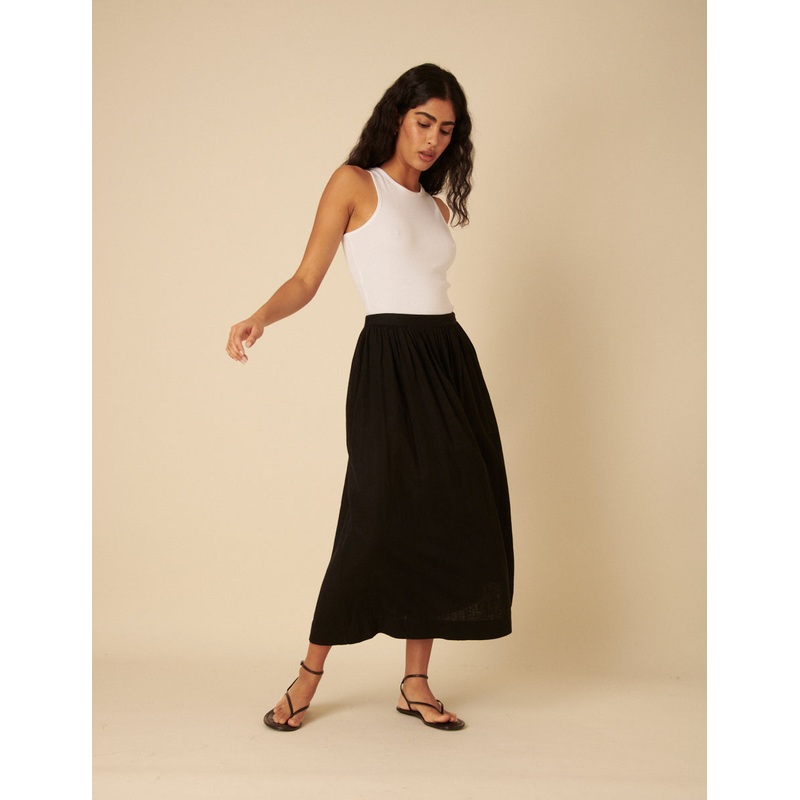 Swishy skirt incoming. Coming in classic black, this is the perfect midi skirt to dress up or down. We love the A-line silhouette and handy pockets. Pair with sandals or heels, depending on your mood.