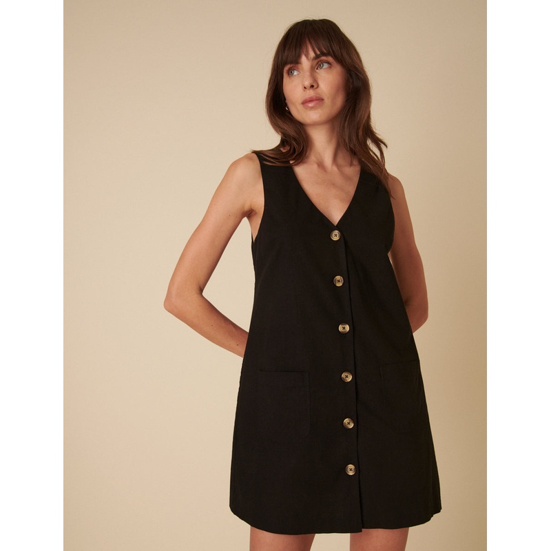 Meet Claudette: the latest black pinny to join NC icons. With a flattering v-neckline, she buttons up at the front and features two patch pockets. Shes perfect to style solo or layered over a jersey top. Were wearing ours with sandals.
