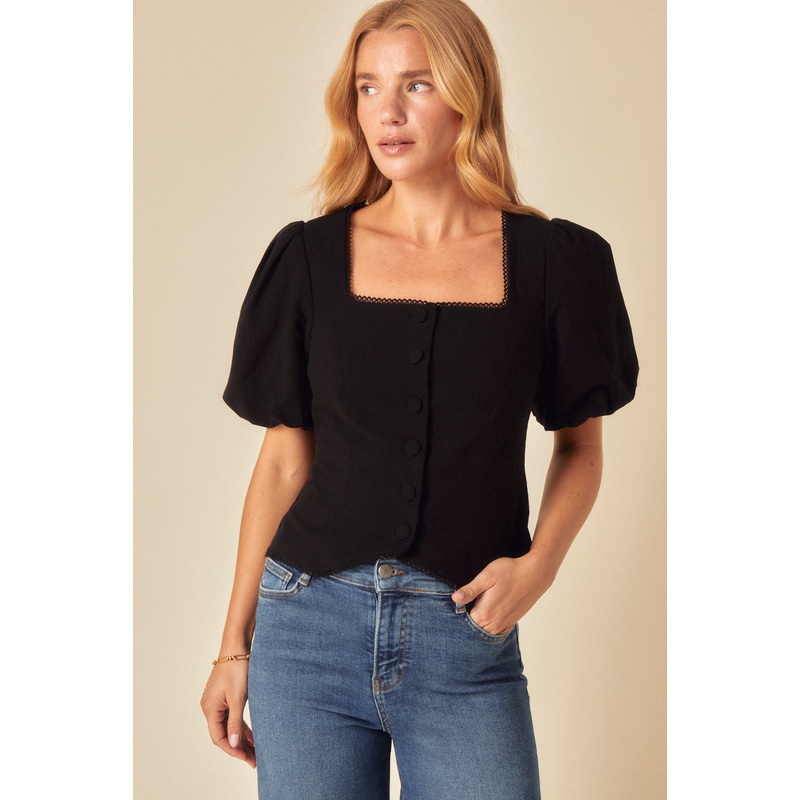 The not-so-basic black top. With perfectly puffed short sleeves and covered button down detail, our top is effortlessly versatile. We love the lace detail along the square neck. Style with your favourite NC jeans.Square neck Short puff sleevesButton front