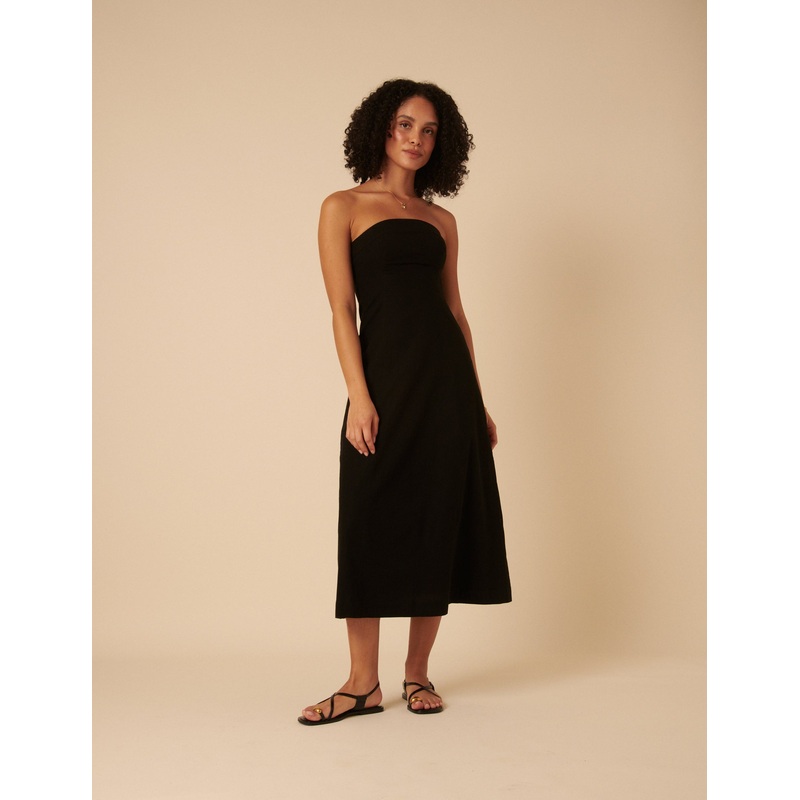 This black bandeau midi dress has a fitted bodice, flowing skirt, and shirred back for the perfect fit. Shes the sundress for sunny days and warm nights. Bandeau neck Concealed zip fastening Designed to be semi-fitted Size tip: we recommend your usual size