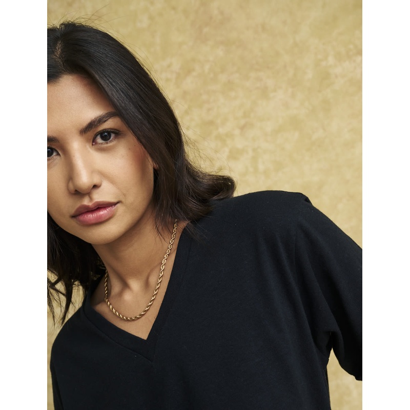 Lighten up. This classic black tee is the definition of easy breezy. Style the oversized cut with wide leg jeans.V-neckShort rolled sleevesSoft slub textureRelaxed fit