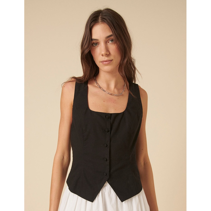 Whats one more waistcoat? Coming in classic black, we love the fitted silhouette and artful button front on our Celeste top. Perfect for wearing solo on warm days, simply style with your favourite NC denim.