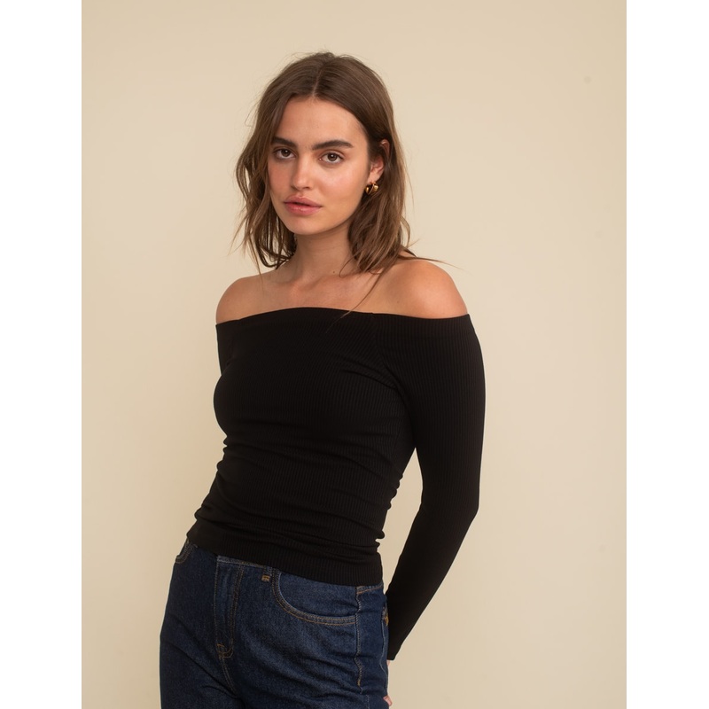 Is there a sleeker look? Were obsessed with this black off-the-shoulder top. This ones blended with a touch of stretch to keep it in place all day long. Tuck it into jeans and satin midi skirts. Off-the-shoulder style Long sleeves Designed for a close cut