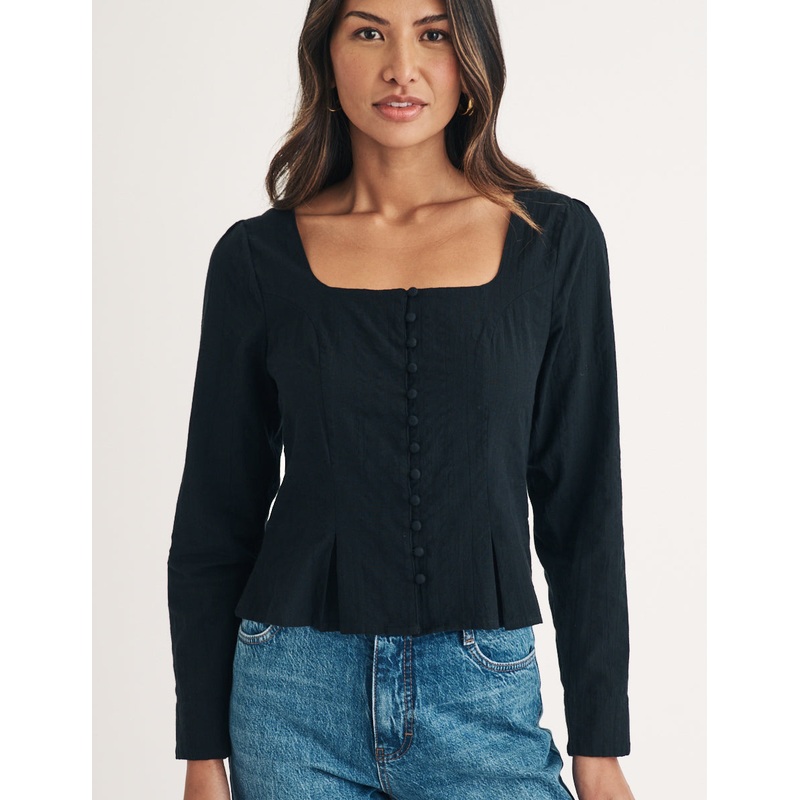 Your new go-to top. Our black Minerva top comes in classic black. We love the fabric covered button-front, understated neckline and nipped in waist with a tie back. Were wearing ours with denim. Scoop neck Long sleeves Button front Size tip: we recommend y