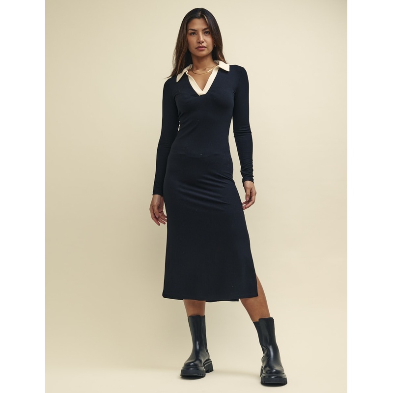 Some things are just timeless. Here weve taken the iconic polo dress and made it into a black midi that feels so of-the-moment. Its ideal for the week but itll look just as good with heels at the weekend. Collar Long sleeves V neck Ribbed texture Soft stre