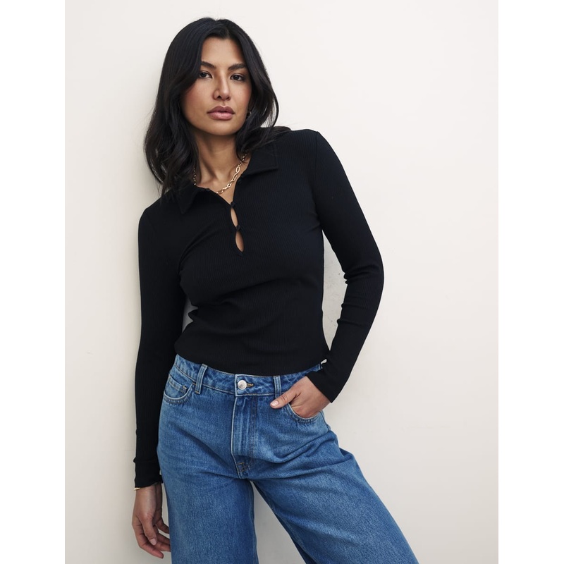 A polo collar top with a little something extra. In classic black, itll go with everything already in your wardrobe. Its cut to follow your frame (or size up if you want a more relaxed look). The buttons are designed to show off a tiny touch of your dcolletage and were here for it.