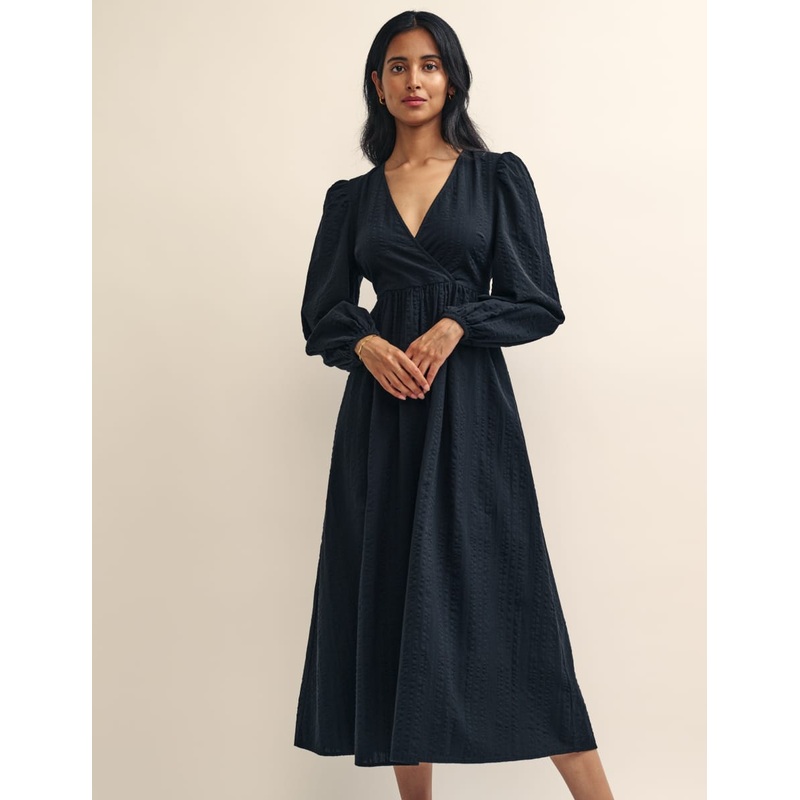 Another black midi you need. With long balloon sleeves, this wrap dress is sure to become a year-round favourite. Dont miss the bow at the back. Just add gold hoops and go.V-neckLong balloon sleevesConcealed zip fasteningBack waist tieA-line skirt that ski
