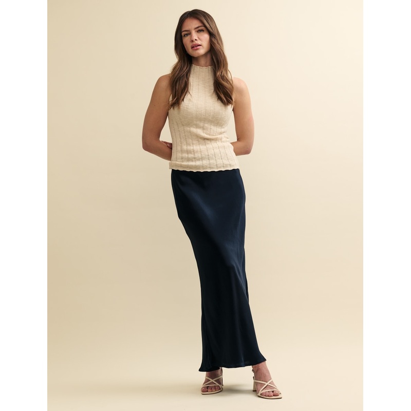 Our Mila slip skirt looks sultry in sleek black satin. It has a soft stretch waist and flattering bias-cut shape. Team it with sumptuous knits for day.