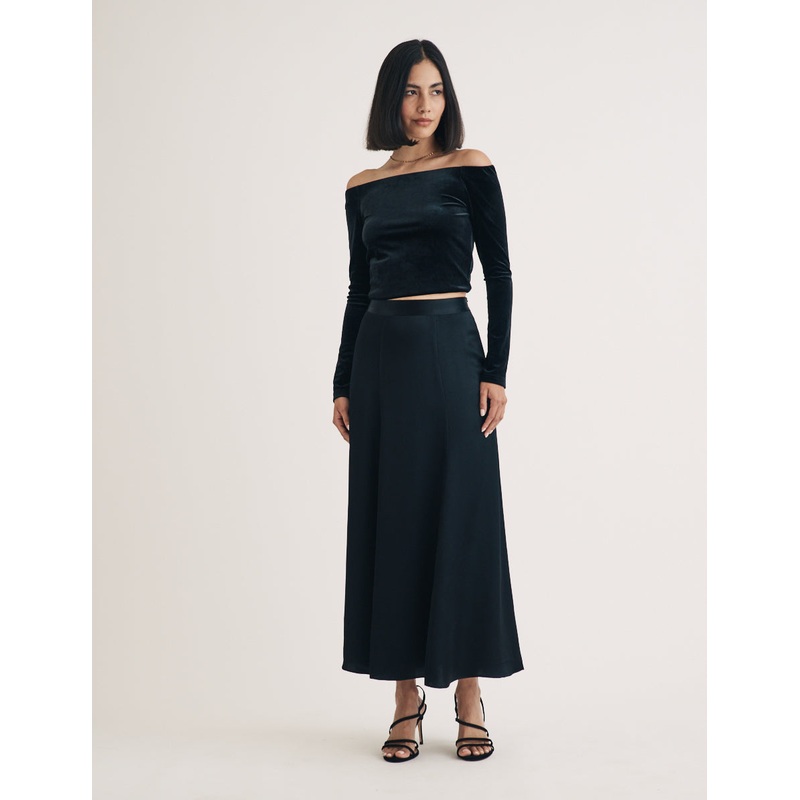 A moment for Milo. This classic black number is one youll be reaching for again and again. Were obsessed with her flattering waistline and swishy skirt that skims the body. Pair yours with barely-there heels for that so-now and so sleek look. Flared hem Re