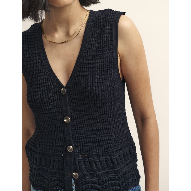 Just the thing for unexpected sunshine. This button-front black vest has been machine knitted to look like crochet. Were obsessed with the artisan-style detailing at the hem. Wear yours solo with denim.