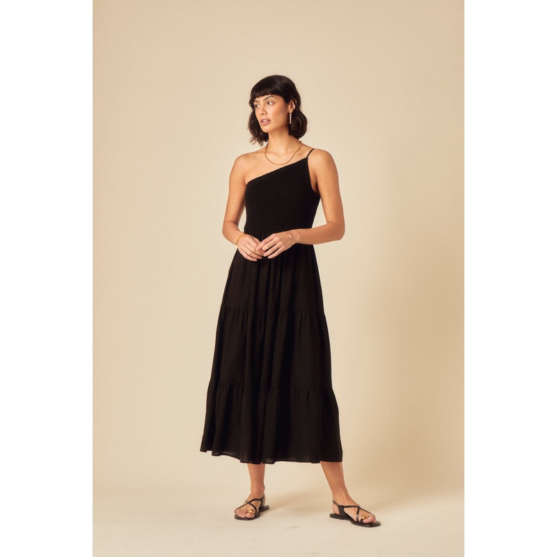 For roaming in style. In classic black with one shoulder, our dress features a shirred bodice, and a swishy skirt for that effortless, flowy vibe.