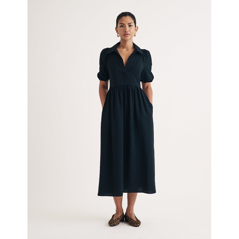 Designed to be worn on repeat. Hebe is a new addition to the collection. She comes in classic black with stylish short puff sleeves and a so-now collar. Were wearing ours with flat pumps.V-neckCollarShort puff sleevesA-line skirt that skims the body