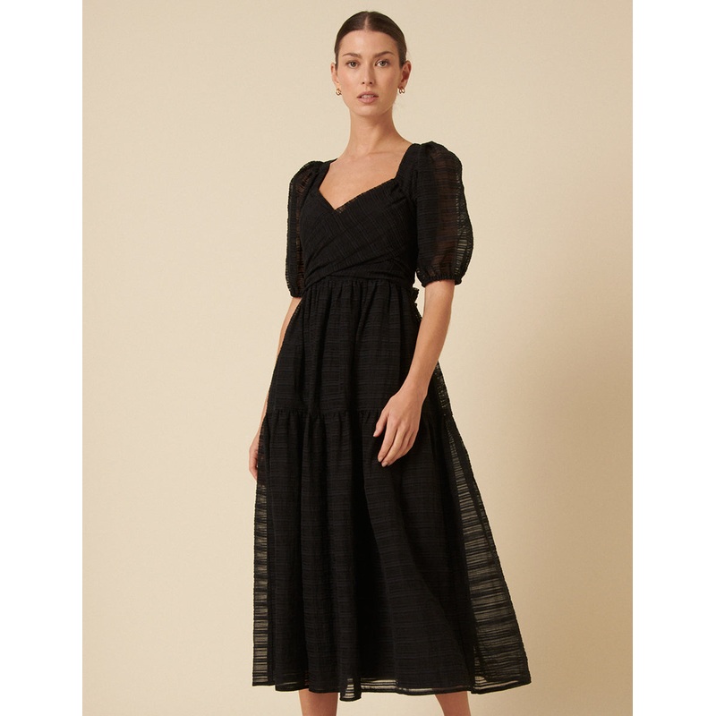 Introducing Sadie. This classic black midi dress is soon-to-be trending. We especially love the voluminous puff sleeves and swishy skirt that skims the body beautifully. Style with barely-there heels to your next event. Sweetheart neckline Panelled waist d