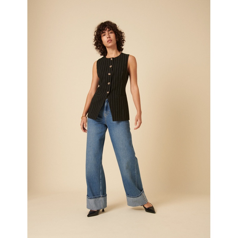 Meet your new favourite waistcoat. In a classic pinstripe, were obsessed with the exaggerated hemline and artful line of buttons down the front. Wear yours with our matching pinstripe trousers. Round neck Button front