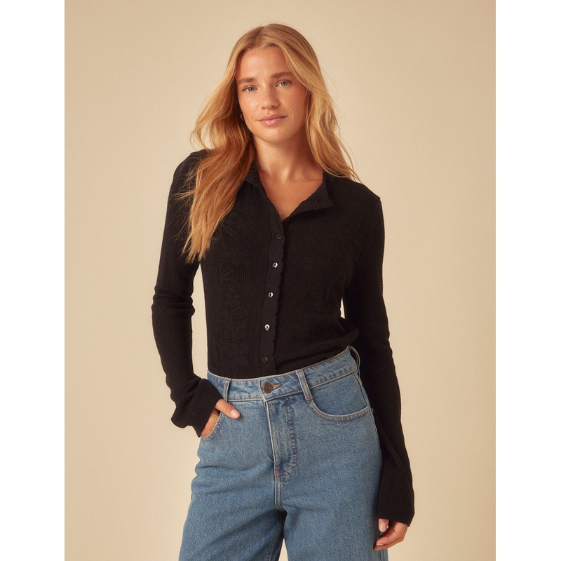 A classic with a little extra. This long sleeve pointelle cardigan in timeless black features a delicate floral design along the bodice and sweet scallop trim. Crew neck Button front Long sleeves Designed to be semi-fitted Size tip: we recommend your usual