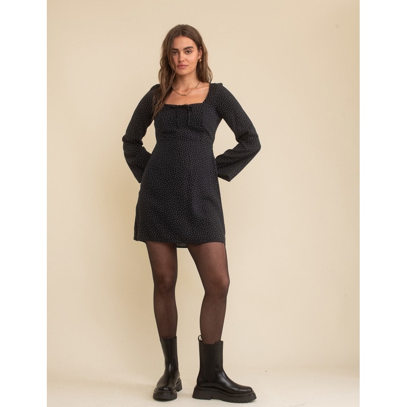 Designed for the spotlight. A fitted waist is complemented by fluted sleeves and a flippy a-line skirt that can be worn with or without tights. Dont miss the sweetheart neckline finished with a string tie detail. Were wearing ours with western boots. Sweet