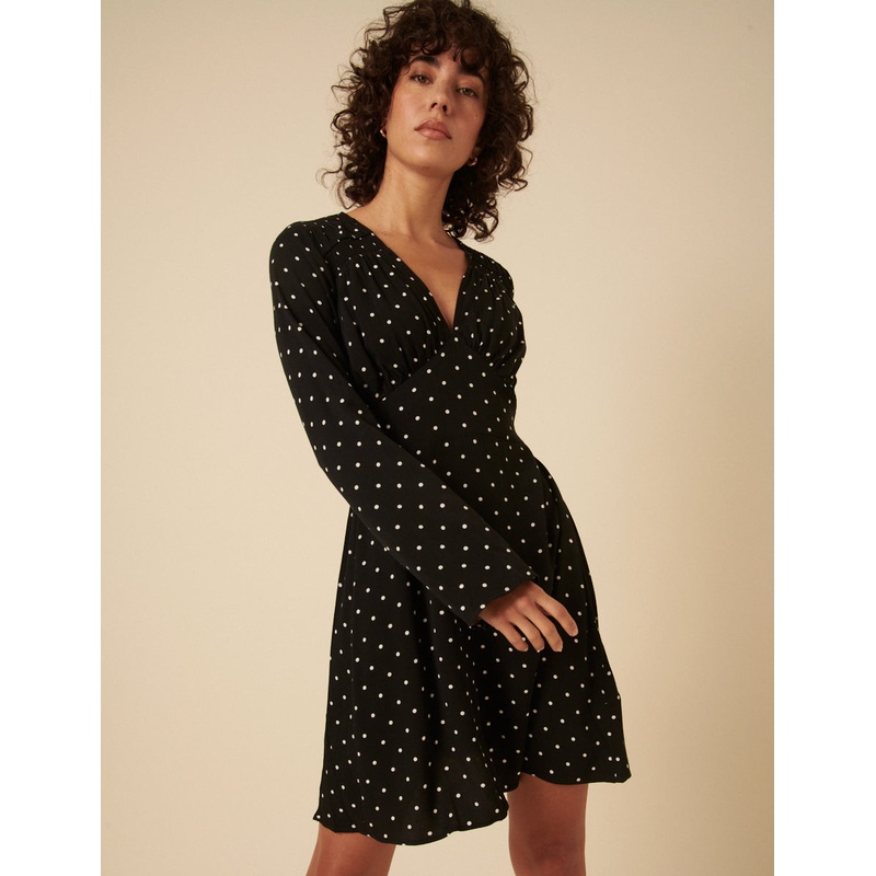 A day dress thatll do night too. In a classic polka dot print and cut to a fit and flare silhouette, our Lydia mini features a curved waist seam designed to flatter and slightly flared long sleeves. Style with your favourite shoes this season.