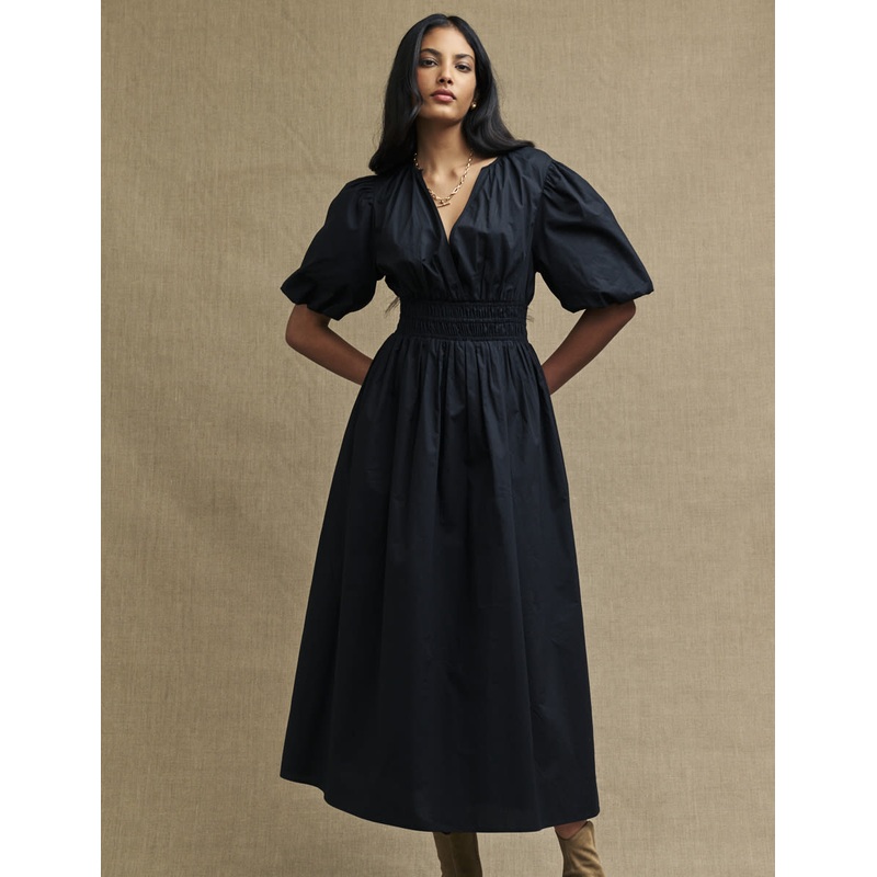 Go incognito in a black dress. This puff sleeve midi is a dream pure and simple. A wrap-effect front, shirred waistline and a-line skirt come together to flatter your shape from all angles. Style yours simply with a hint of gold jewellery.Notch neckMid-len