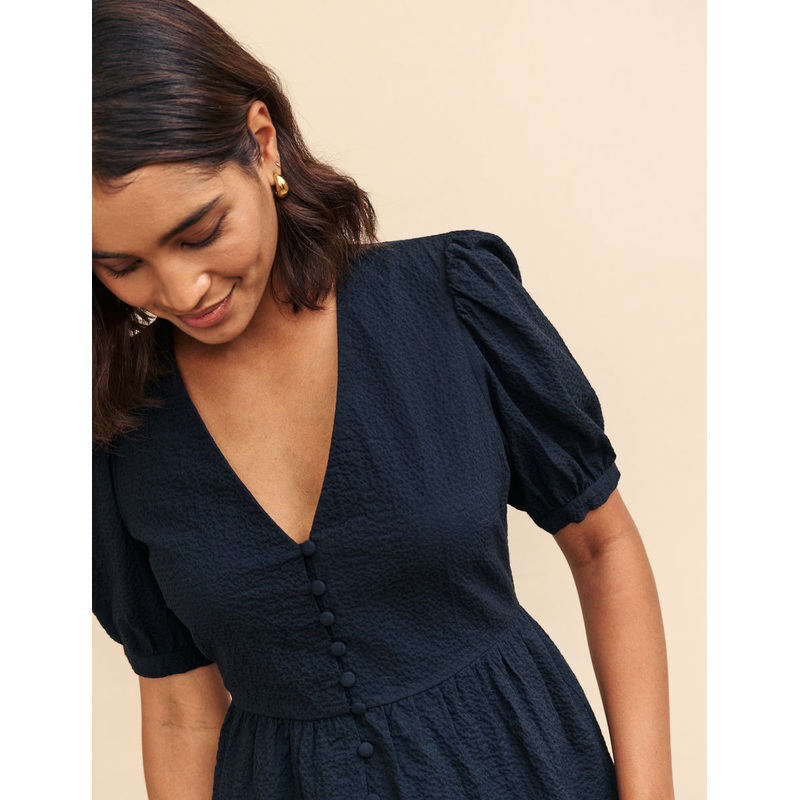 Our Ria blouse has had a spring makeover. With a swishy peplum hem, this black top is the ultimate waist-definer. Puff sleeves and a delicate row of buttons add to the look. Style yours with everything you already own. V-neck Short puff sleeves Buttons Pep