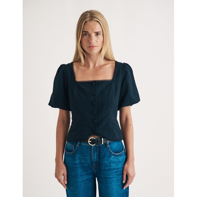 That little black top. We love the perfect puff sleeves, elegant square neckline and flattering hemline. The best part? It goes with absolutely everything. Were wearing ours with dark wash denim.Square neckShort puff sleevesCovered buttonsTrim detailing
