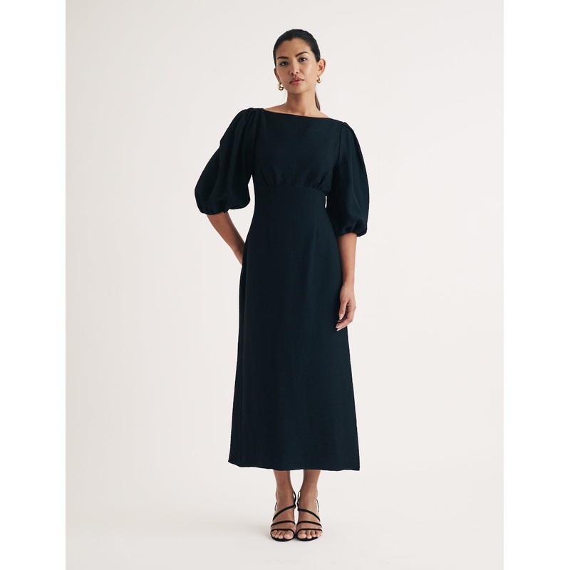 Say hello to Hannah. This classic black number is perfect for that invitation you just got. We love the flattering fitted waist thats balanced by billowing ballon sleeves. Shes swishy too. Were wearing ours with pointed heels.Boat neckLong balloon sleevesF