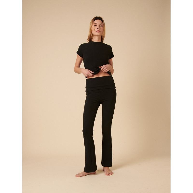 Yoga trousers that move with you. Coming in classic black, our soft, ribbed trousers are both flared and flattering, for whether you're stretching or just lounging. We love the fold over waistband detail. Style with everything you already own.Fit and flare