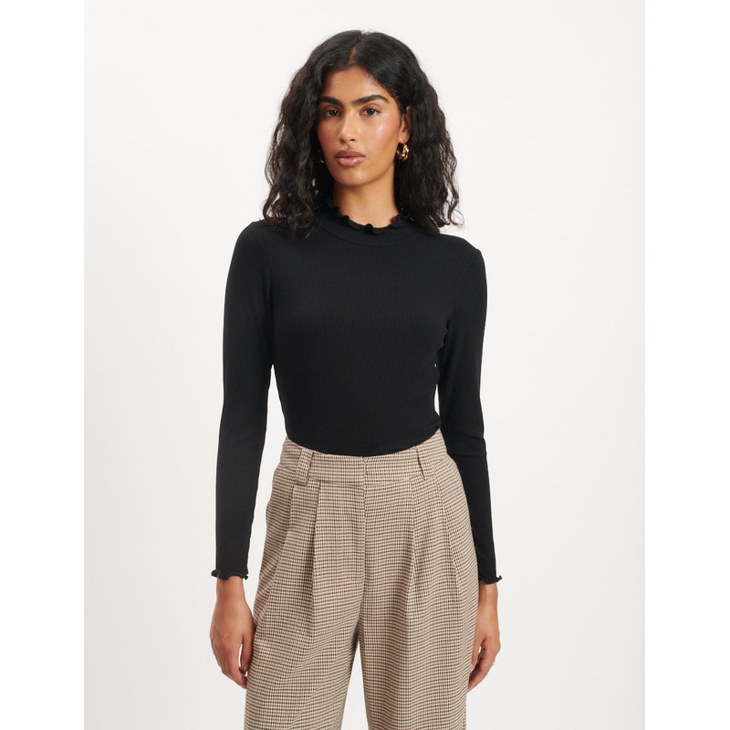 An NC essential. Were obsessed with the frilled lettuce collar on this classic black top. The close cut and long sleeves make it the ultimate outfit-builder this autumn. Wear yours solo or layered with a pinny.Frilled lettuce collarLong sleevesRibbed textu