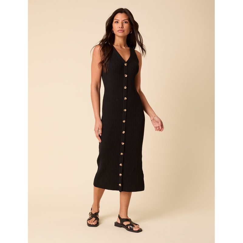 Feel fine in this. Black fine knit dress features a flattering v-neck and bold contrast buttons. Unbutton a few for a laid-back look.Round neckButton front detailSize tip: we recommend your usual size
