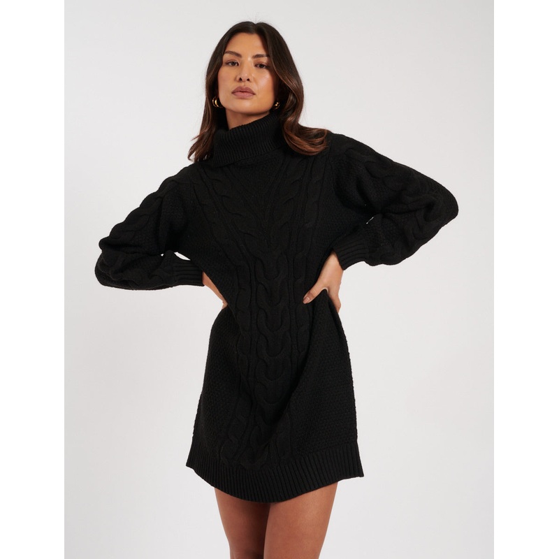 The throw-on-and-go dress. Designed with a chunky cable knit texture, youll reach for our classic black mini dress again and again. We love the high neck and long sleeves with thick ribbed trim detailing. Were pairing ours with knee-high boots High neck Lo