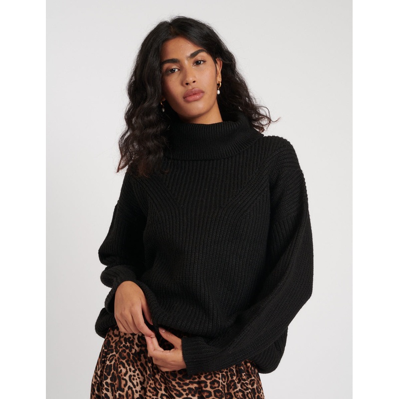 The cold-weather layer your wardrobe needs. Our classic black jumper will be your new go to. We love the warm roll neck and chunky ribbed texture. Were wearing ours with a leopard print skirt. Roll neck Long sleeves Ribbed texture Designed for a relaxed cu