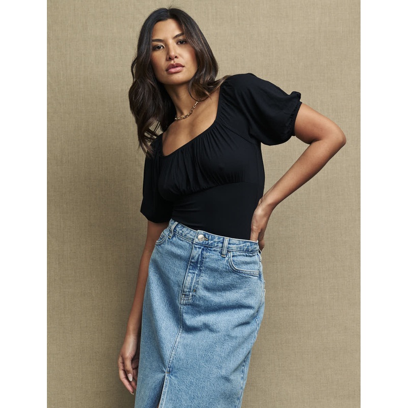Oh this new number? This classic black top is sure to elicit all the compliments. It comes with a square neckline, ruched bodice and puff sleeves. Add it to your wardrobe itll go with everything. Square neck Short puff sleeves Soft stretch jersey fabric De