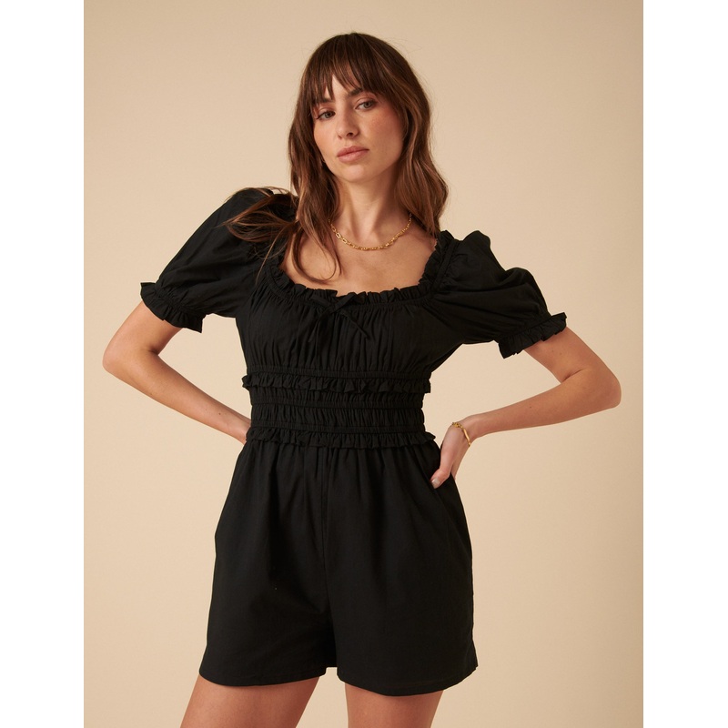 Black but never basic. Our playsuit features short sleeves and shirring across the bodice for the perfect fit. We love the pretty bow detail too. Square neck Short sleeves Elasticated waist for comfort Designed to be semi-fitted Size tip: we recommend your