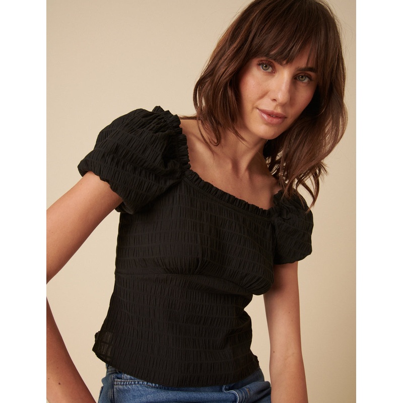 Check it out. Coming in a classic black, our Ramona top is designed with a romantic square neckline and short puff sleeves. Wear with denim or a statement white skirt. Square neckShort puff sleevesFitted bodice that defines the waistSize tip: we recommend