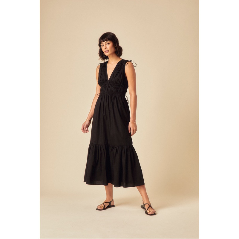 The black dress youll wear year after year. Complete with shirred detailing, our maxi dress features string tie detail at the straps and waist. V neck, underbust seams and tiered skirt. Just add sandals and touches of gold.