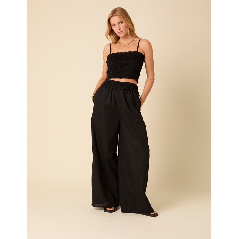New black trousers for your line-up. These ones come with a classic wide leg cut and a ruffle trim waistband that matches back to our top perfectly. Pockets included, obviously. Shirred waistline Side pockets Wide leg cut that skims the body Size tip: we r