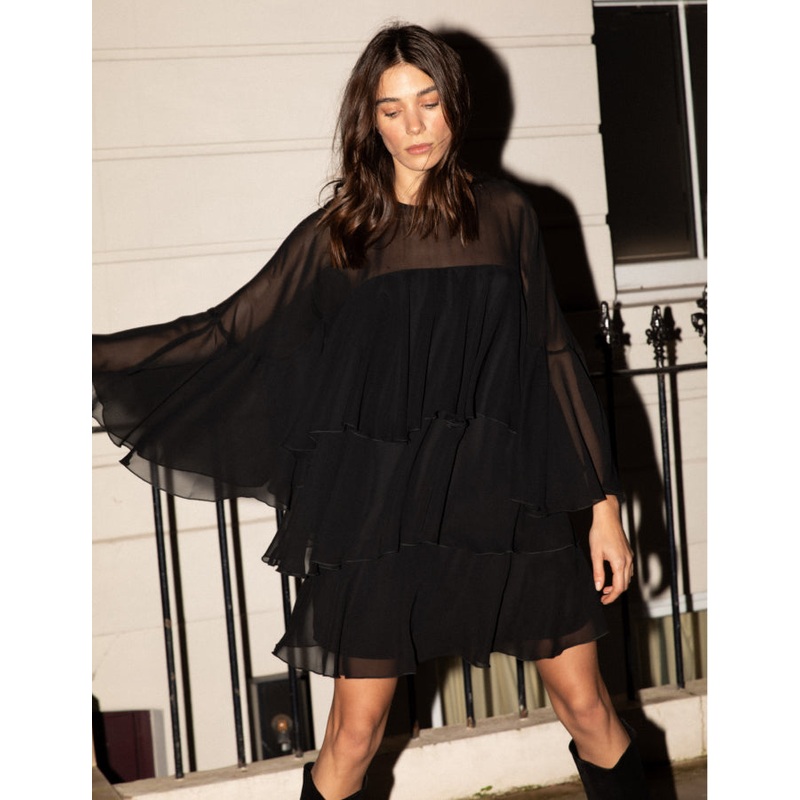 Meet the mini of the moment. Coming in classic black, our mini dress features romantic ruffles that cascade down the tiered silhouette. We love the floaty sleeves too. Style with barely-there heels. Crew neckConcealed zip fasteningDesigned for a relaxed fi