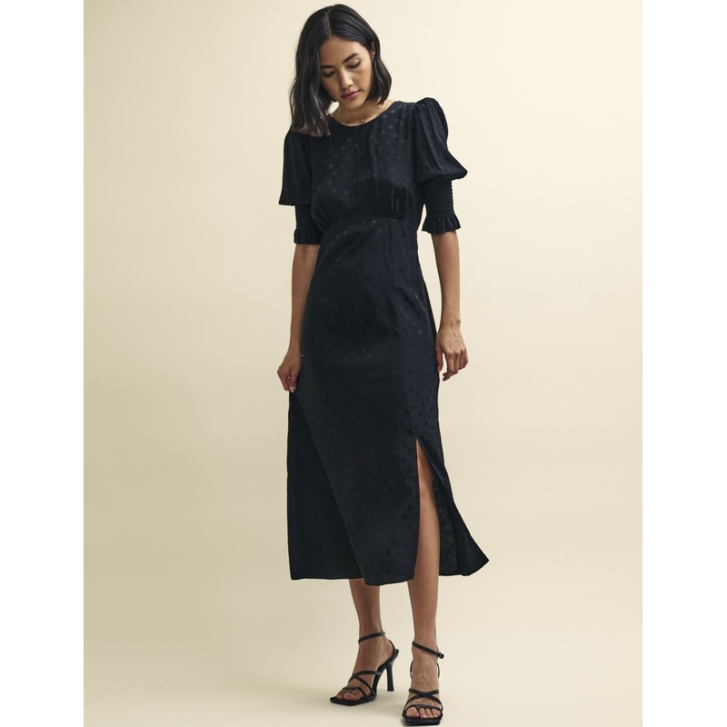 Expect compliments in our Luna midi. In a vintage-inspired shape with shirred cuffs, subtle frills and a leg-lengthening slit, shes low-key but elevated in an instant. So much more than just a black tea dress, Luna does dinner reservations too and we love her in this new satin jacquard design detailed with a polka dot pattern. Elevate yours with barely-there sandals or towering platforms.