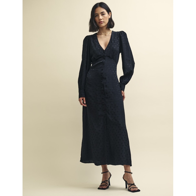 Meet Tasha. Shes a retro-inspired midaxi thatll suit special events and low-key occasions alike. Made from black satin jacquard, this one comes detailed with a polka dot pattern. Pair with barely-there sandals or towering platforms. V-neck Long balloon sle