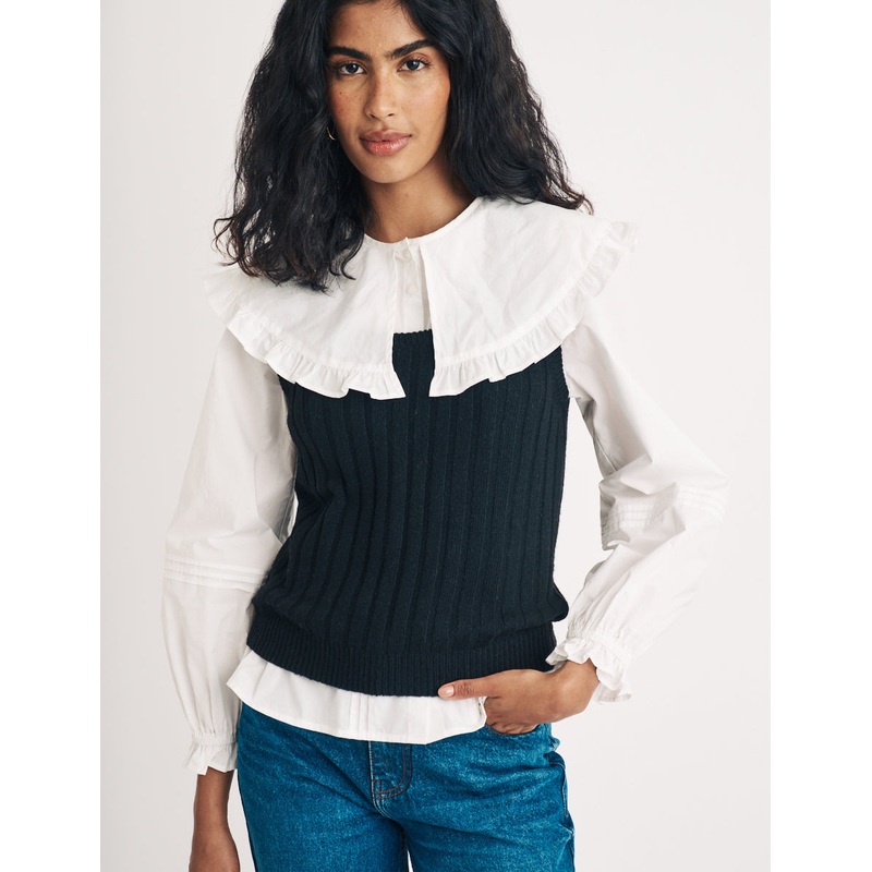 Calling all cool girls, weve got your new autumn essential and it comes in classic black. A scoop neck and ribbed detailing elevate a cosy staple to a so-now style statement. Style yours with your favourite jeans and boots.
