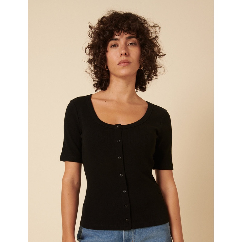 A perfect layer to add to your wardrobe. Coming in classic black, we love the button-through front, short sleeves and close-cut fit. Were wearing ours with denim shorts. Scoop neck Short sleeves Button down front Size tip: we recommend your usual size