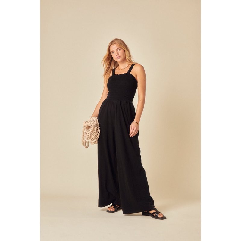 Another great jumpsuit. Coming in classic black, a shirred bodice amplifies the waist with thick straps designed to cover your bra. Dont miss those pockets either. Square neck Thick straps Shirred bodice that defines the waist Wide leg cut that skims the b