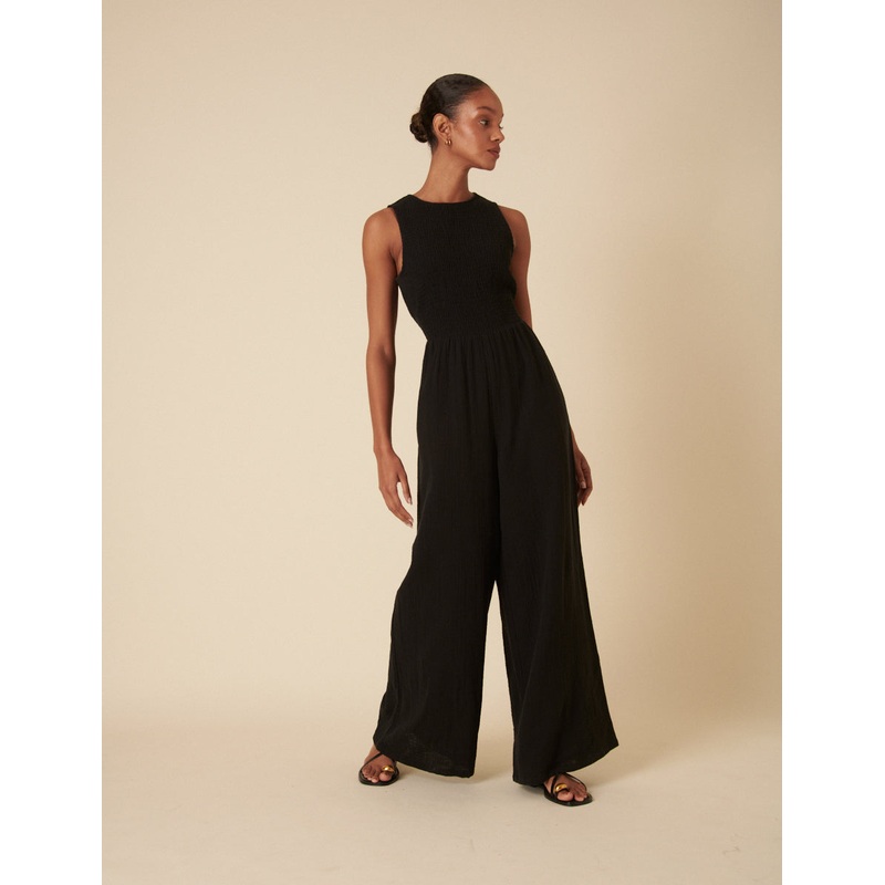 An outfit in an instant. This classic black one is perfect for everyday. A shirred bodice amplifies the waist before falling to a wide leg cut that skims the body. Style yours with sandals. Round neck Shirred bodice that defines the waist Wide leg cut that