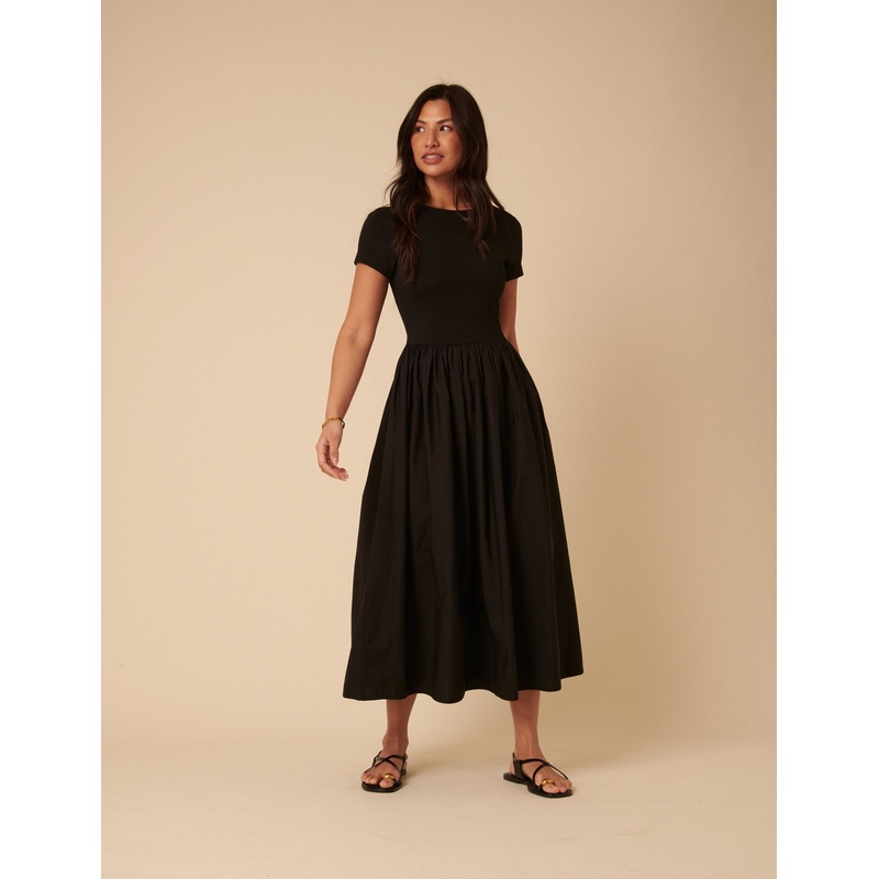Say hello to Sarah. Coming in classic black, we love the crew neck thats balanced by an open scoop back. Plus the close fitting top that falls into a relaxed swishy skirt is a winner for every occasion. Were wearing ours with barely-there heels.