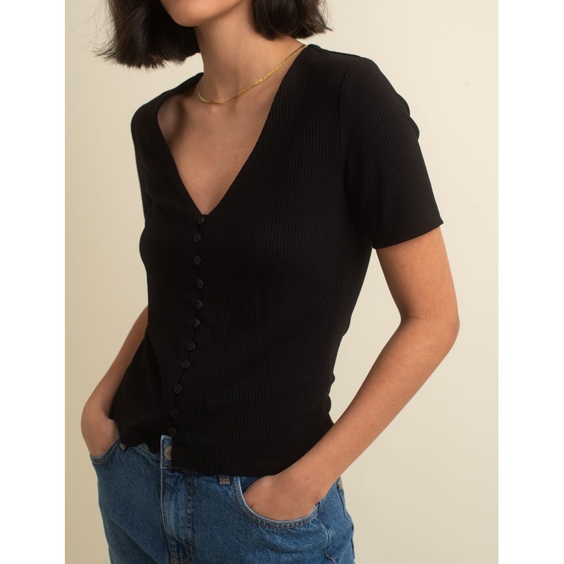 "Shaped with short sleeves for easy year-round layering. Style yours with tonal shorts for a neutral look.V-neckShort sleevesButton front"