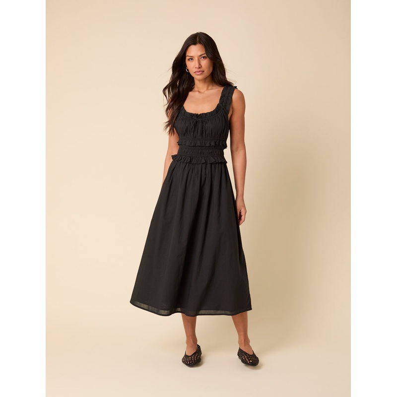 An essential requirement. This midi dress might be finished with frills, shirring and a string tie scoop neck, but itll also go with everything you already own.