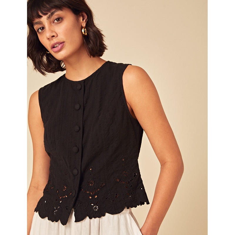 Not your basic black top. Featuring a tailored fit and broderie anglaise trim, we love the button detail on our top. Style with everything you already own. Crew neck Sleeveless Button front Size tip: we recommend your usual size