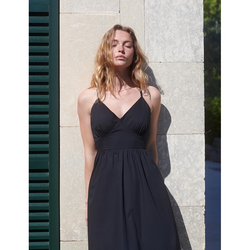 Need a black summer dress? Bring in Billie. Shes finished with flattering cross-back ties and cut-out detailing. Simply effortless, Billies designed to take you straight from the sand to a summer soire. Her relaxed fit makes her an airy option for any hot day. Simply team her with gold accents for an evening look.